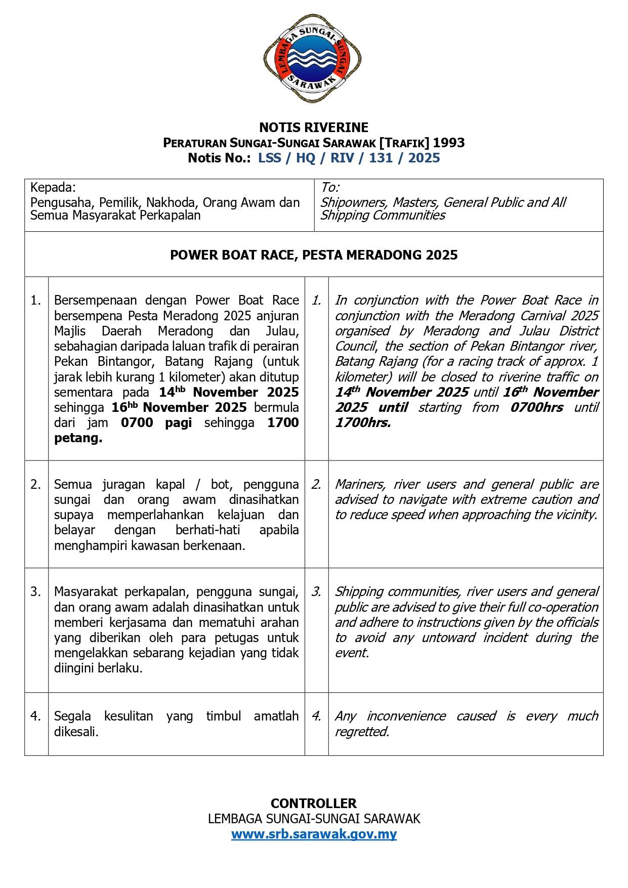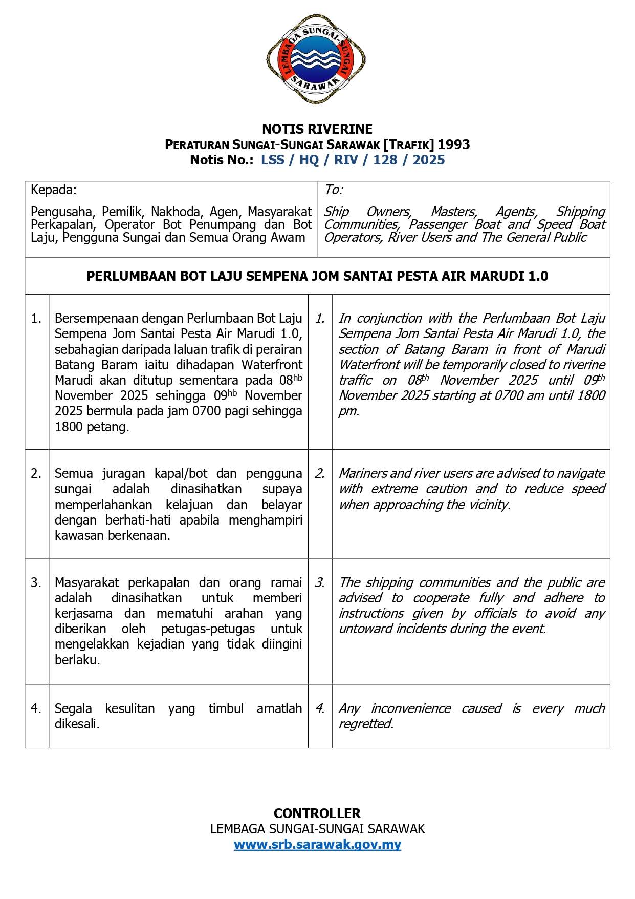 Issue No 37_LN 103 Sarawak Rivers Traffic (AMENDMENT TO THE SCHEDULE) REGULATIONS, 2025 (Made under section 38)