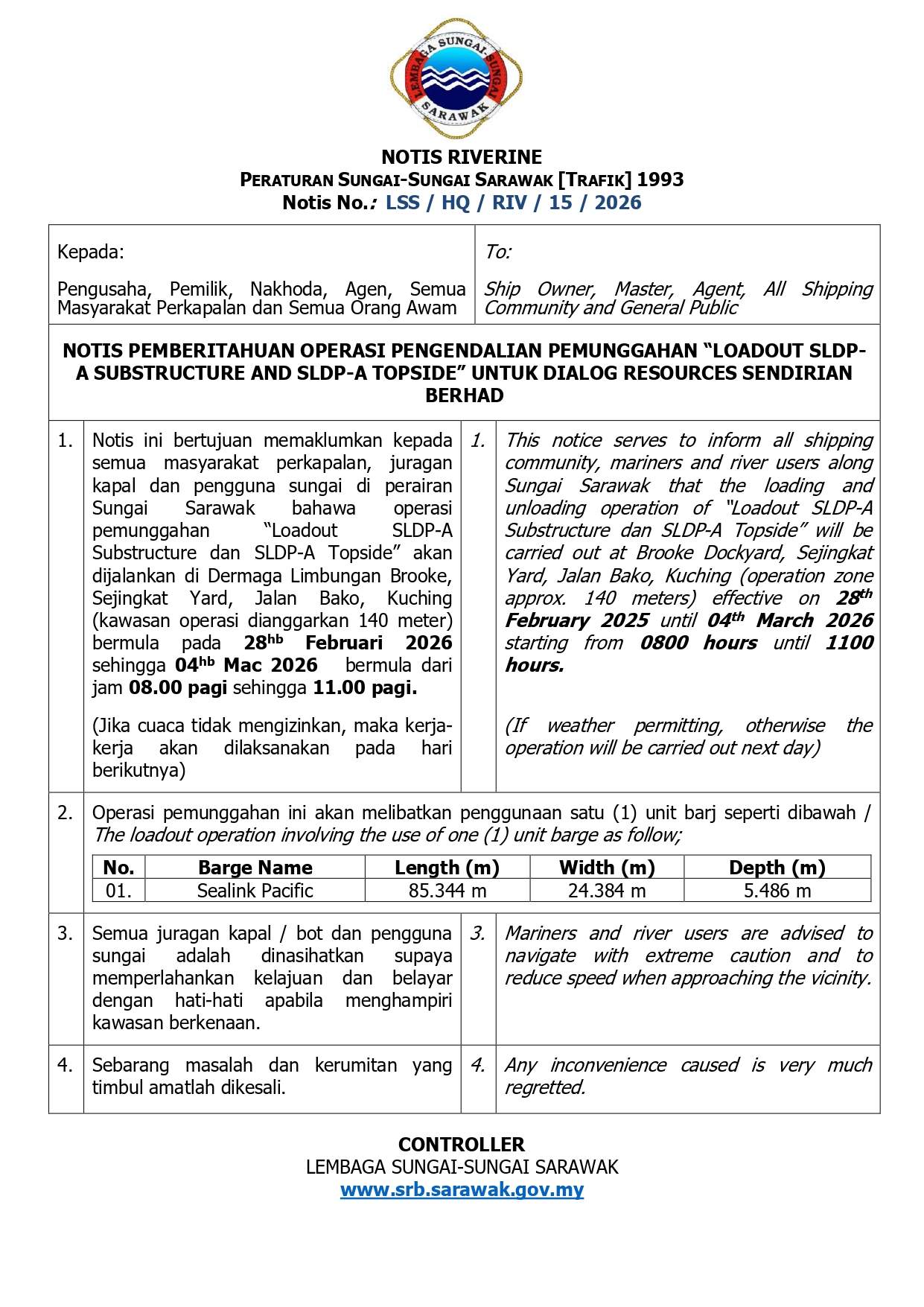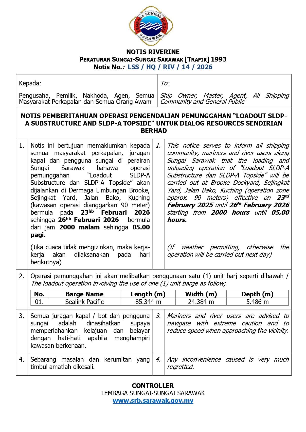 NOTIS OPERASI PENGENDALIAN PEMUNGGAHAN LOADOUT SLDP-A SUBSTRUCTURE & SLDP-A TOPSIDE