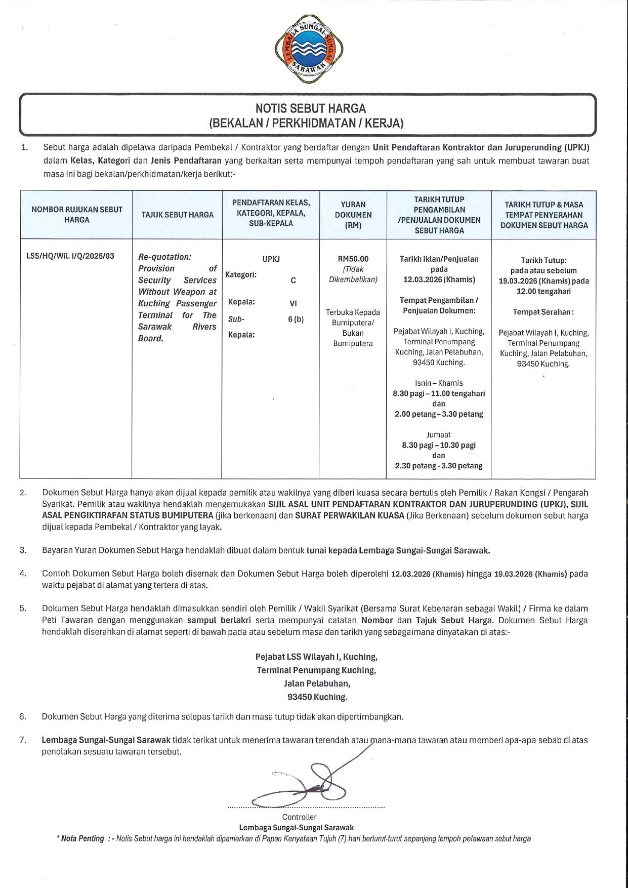 NOTIS SEBUT HARGA- RE-QUOTATION PROVISION OF SECURITY SERVICES WITHOUT WEAPON AT KUCHING PASSENGER TERMINAL FOR SRB