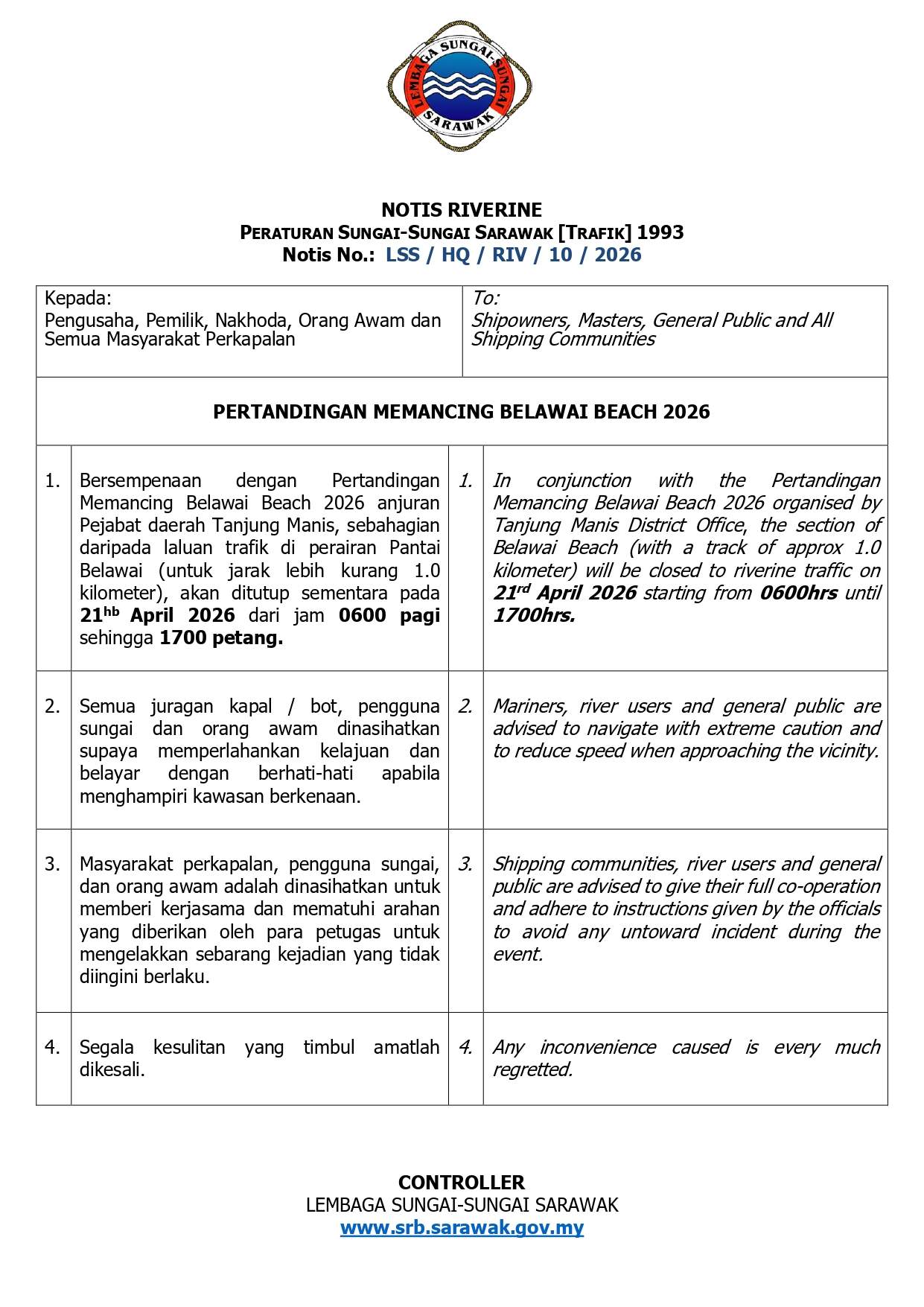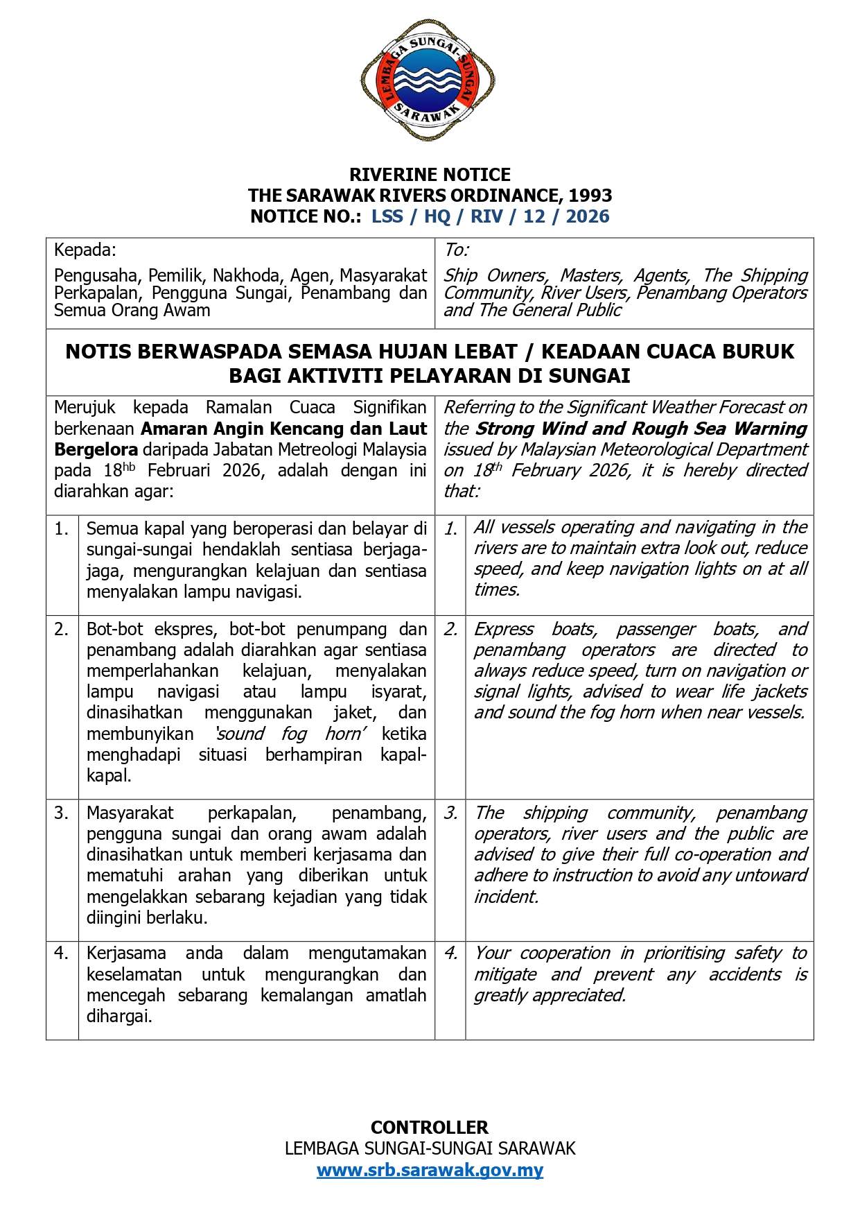(18) NOTIS BERWASPADA SEMASA HUJAN LEBAT KEADAAN CUACA BURUK BAGI AKTIVITI PELAYARAN DI SUNGAI 10 MAC 2026